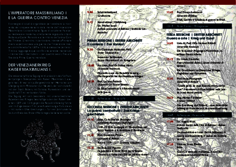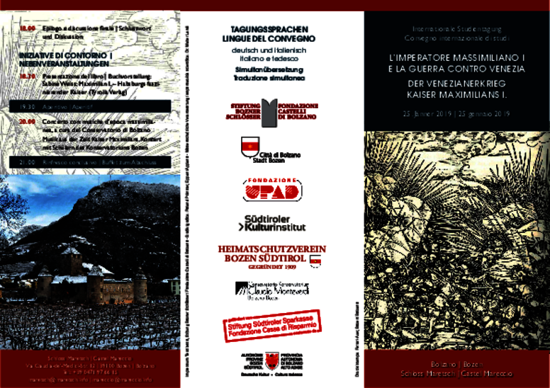 Namhafte Referenten werden sich mit bislang wenig beachteten Aspekten der neuen Techniken und propagandistischen Formen der Kriegsführung, dem Übergang von der Gotik zur Frührenaissance, den wirtschafts- und besonders geldgeschichtlichen Reformen und nicht zuletzt mit den Neuerungen in der Musik beschäftigen. Vor Abschluss des Venedigerkrieges hatte Maximilian in seiner Familienpolitik große Erfolge zu verzeichnen. Venedig war durch diesen achtjährigen Krieg so erschöpft, dass es keine entscheidende Landmacht mehr war und Tirol erhielt so seine endgültigen Grenzen. Am Abend beschließt ein vom Konservatorium in Bozen organisiertes Konzert mit kundiger Einführung die Tagung.